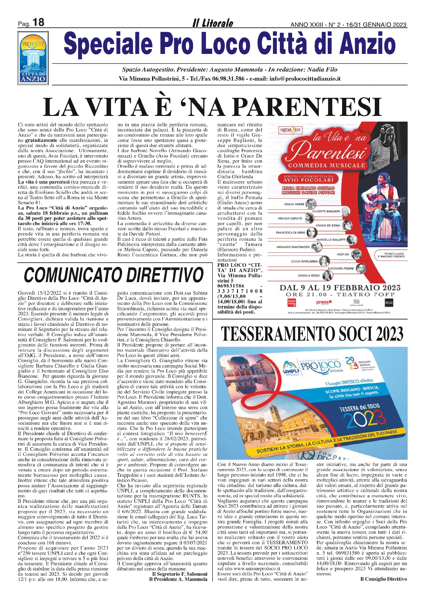 Giovedì 15/12/2022 si è riunito il Consiglio Direttivo della Pro Loco “Città di Anzio” per discutere e deliberare sulle iniziative realizzate e da intraprendere per l’anno 2023. Essendo presente il numero legale di Consiglieri, dichiara valida la riunione e inizia i lavori chiedendo al Direttivo di nominare il Segretario per la stesura del relativo verbale. Il Consiglio indica all’unanimità il Consigliere F. Salomoni per lo svolgimento delle funzioni inerenti. Prima di iniziare la discussione degli argomenti all’OdG, il Presidente, a nome dell’intero Consiglio, dà il benvenuto alle nuove Consigliere Barbara Chiarello e Giulia Giangiulio e il bentornato al Consigliere Elso Biancone. Per quanto riguarda la giovane G. Giangiulio, ricorda la sua preziosa collaborazione con la Pro Loco e gli studenti dei College Americani in occasione del loro corso enogastronomico presso l’Istituto Alberghiero M.G. Apicio e si augura che il suo ingresso possa finalmente dar vita alla “Pro Loco Giovani” tanto necessaria per il prosieguo negli anni delle attività dell’Associazione ma che finora non si è mai riusciti a rendere operativa.