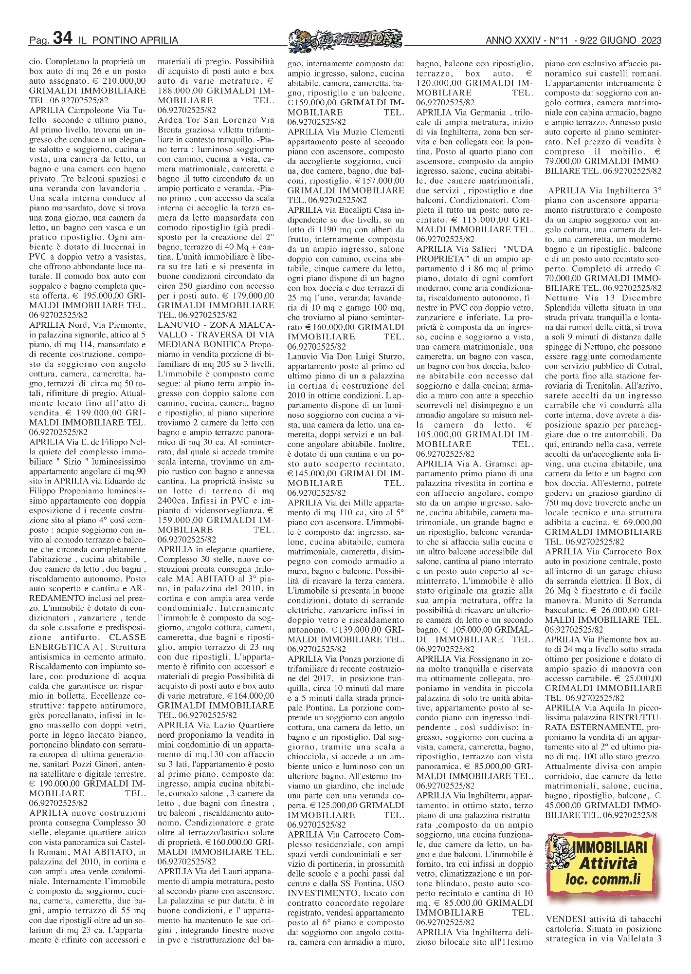 APRILIA via Eucalipti Casa indipendente su due livelli, su un lotto di 1190 mq con alberi da frutto, internamente composta da un ampio ingresso, salone doppio con camino, cucina abitabile, cinque camere da letto, ogni piano dispone di un bagno con box doccia e due terrazzi di 25 mq l’uno, veranda; lavanderia di 10 mq e garage 100 mq, che troviamo al piano seminterrato €160.000,00 GRIMALDI IMMOBILIARE TEL. 06.92702525/82