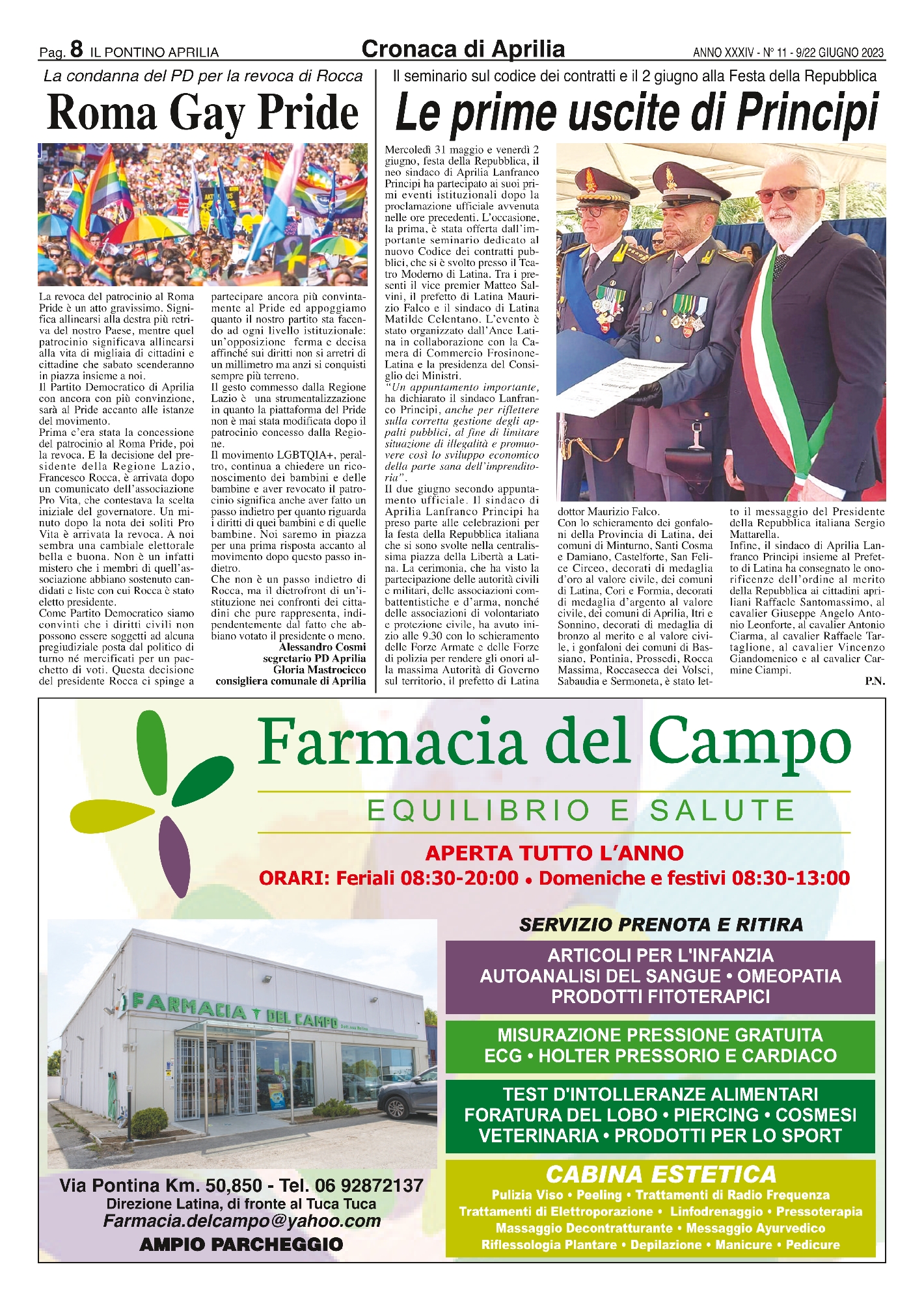 Mercoledì 31 maggio e venerdì 2 giugno, festa della Repubblica, il neo sindaco di Aprilia Lanfranco Principi ha partecipato ai suoi primi eventi istituzionali dopo la proclamazione ufficiale avvenuta nelle ore precedenti. L’occasione, la prima, è stata offerta dall’importante seminario dedicato al nuovo Codice dei contratti pubblici, che si è svolto presso il Teatro Moderno di Latina. Tra i presenti il vice premier Matteo Salvini, il prefetto di Latina Maurizio Falco e il sindaco di Latina Matilde Celentano. L’evento è stato organizzato dall’Ance Latina in collaborazione con la Camera di Commercio Frosinone-Latina e la presidenza del Consiglio dei Ministri.