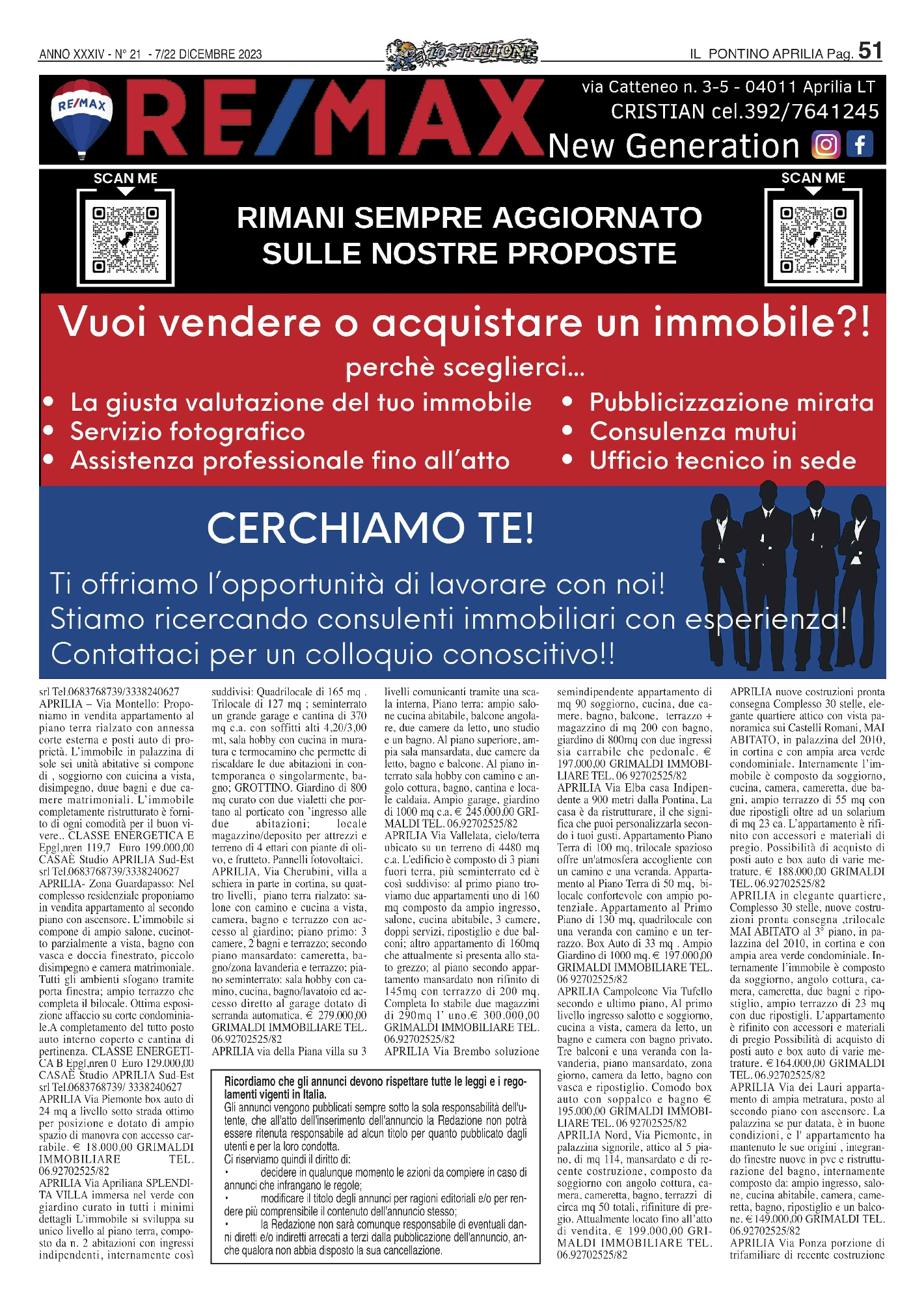 APRILIA Nord, Via Piemonte, in palazzina signorile, attico al 5 piano, di mq 114, mansardato e di recente costruzione, composto da soggiorno con angolo cottura, camera, cameretta, bagno, terrazzi di circa mq 50 totali, rifiniture di pregio. Attualmente locato fino all’atto di vendita. € 199.000,00 GRIMALDI IMMOBILIARE TEL. 06.92702525/82