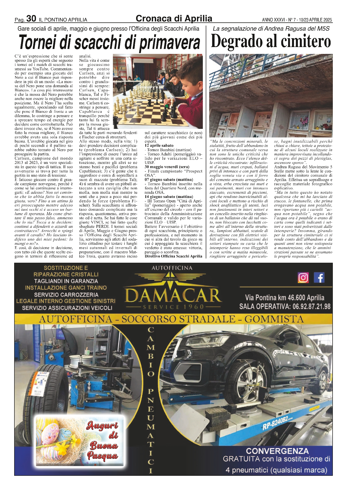 Allo stesso modo, nella vita: 1) devi prendere decisioni complicate (problema Carlsen); 2) hai l’impressione di essere l’unico ad agitarsi e soffrire in una certa situazione, mentre gli altri se ne stanno beati e pacifici (problema Capablanca); 3) c’è gente che ti aggredisce e cerca di sopraffarti a suon di mazzate (problema Tal); 4) ti sembra di avere un pitbull attaccato a una caviglia che non molla, non molla mai mentre tu senti che a poco a poco stai perdendo le forze (problema Fischer). Sulla scacchiera si affrontano domande complicate ma la risposta, quantomeno, arriva presto ed è netta. Se hai fatto le cose giuste VINCI, se hai fatto quelle sbagliate PERDI. I tornei sociali di Aprile, Maggio e Giugno presso l’Officina degli Scacchi Aprilia, serviranno agli atleti del sodalizio cittadino per testare i lunghi mesi autunnali ed invernali di preparazione, con il maestro Matteo Troia, quanto avranno inciso sul carattere scacchistico (e non) dei più giovani come dei più esperti.