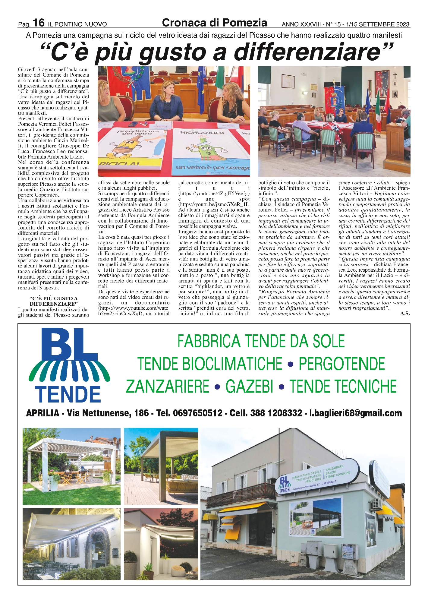 Giovedì 3 agosto nell’aula consiliare del Comune di Pomezia si è tenuta la conferenza stampa di presentazione della campagna “C’è più gusto a differenziare”. Una campagna sul riciclo del vetro ideata dai ragazzi del Picasso che hanno realizzato quattro manifesti.