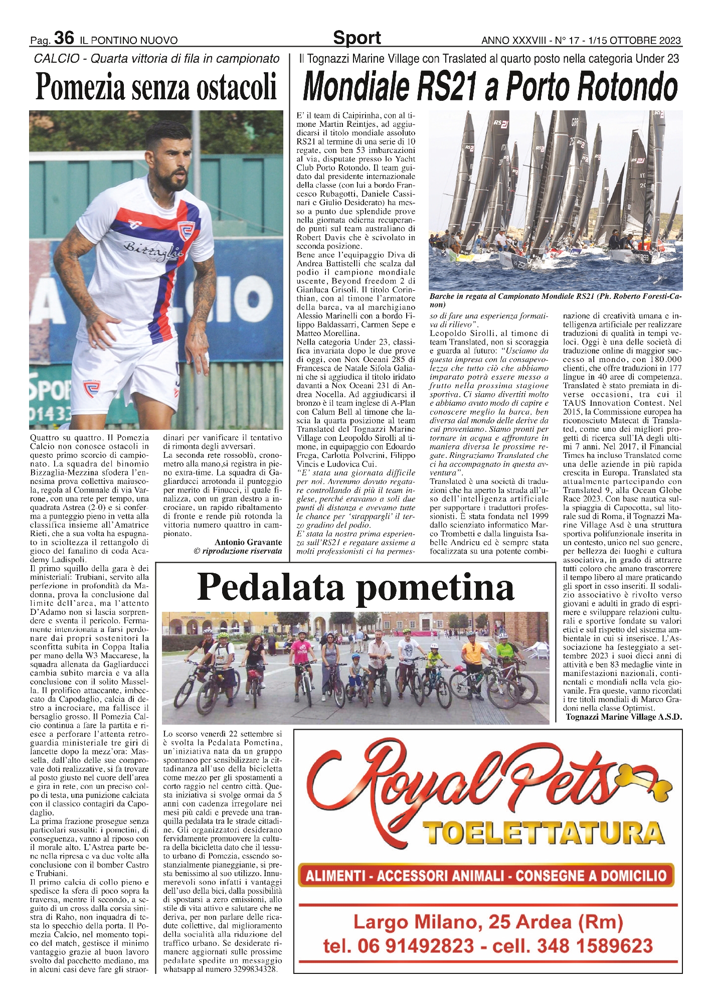 Translated è una società di traduzioni che ha aperto la strada all’uso dell’intelligenza artificiale per supportare i traduttori professionisti. È stata fondata nel 1999 dallo scienziato informatico Marco Trombetti e dalla linguista Isabelle Andrieu ed è sempre stata focalizzata su una potente combinazione di creatività umana e intelligenza artificiale per realizzare traduzioni di qualità in tempi veloci. Oggi è una delle società di traduzione online di maggior successo al mondo, con 180.000 clienti, che offre traduzioni in 177 lingue in 40 aree di competenza. Translated è stato premiata in diverse occasioni, tra cui il TAUS Innovation Contest. Nel 2015, la Commissione europea ha riconosciuto Matecat di Translated, come uno dei migliori progetti di ricerca sull’IA degli ultimi 7 anni. Nel 2017, il Financial Times ha incluso Translated come una delle aziende in più rapida crescita in Europa. Translated sta attualmente partecipando con Translated 9, alla Ocean Globe Race 2023. Con base nautica sulla spiaggia di Capocotta, sul litorale sud di Roma, il Tognazzi Marine Village Asd è una struttura sportiva polifunzionale inserita in un contesto, unico nel suo genere, per bellezza dei luoghi e cultura associativa, in grado di attrarre tutti coloro che amano trascorrere il tempo libero al mare praticando gli sport in esso inseriti. Il sodalizio associativo è rivolto verso giovani e adulti in grado di esprimere e sviluppare relazioni culturali e sportive fondate su valori etici e sul rispetto del sistema ambientale in cui si inserisce. L’Associazione ha festeggiato a settembre 2023 i suoi dieci anni di attività e ben 83 medaglie vinte in manifestazioni nazionali, continentali e mondiali nella vela giovanile. Fra queste, vanno ricordati i tre titoli mondiali di Marco Gradoni nella classe Optimist.