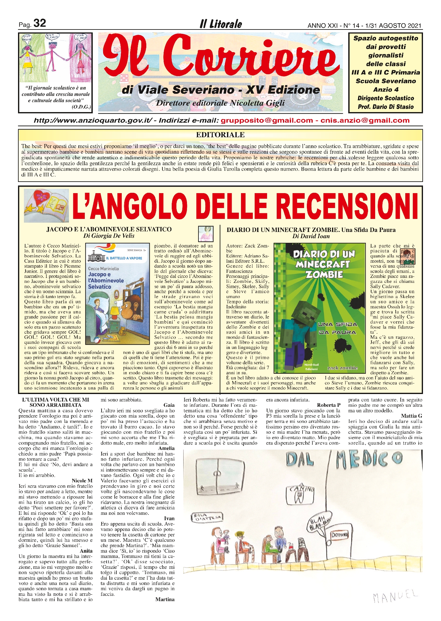 The best: Per questi due mesi estivi proponiamo ‘il meglio’, o per darci un tono, ‘the best’ delle pagine pubblicate durante l’anno scolastico. Tra arrabbiature, sgridate e spese al supermercato bambine e bambini narrano scene di vita quotidiana riflettendo su se stessi e sulle reazioni che sorgono spontanee di fronte ad eventi della vita, con la spregiudicata spontaneità che rende autentico e indimenticabile questo periodo della vita. Proponiamo le nostre rubriche: le recensioni per chi volesse leggere qualcosa sotto l’ombrellone, lo spazio della gentilezza perché la gentilezza anche in estate rende più felici e spensierati e le curiosità della rubrica C'è posta per te. La consueta visita dal medico è simpaticamente narrata attraverso colorati disegni. Una bella poesia di Giulia Turolla completa questo numero. Buona lettura da parte delle bambine e dei bambini di III A e III C.