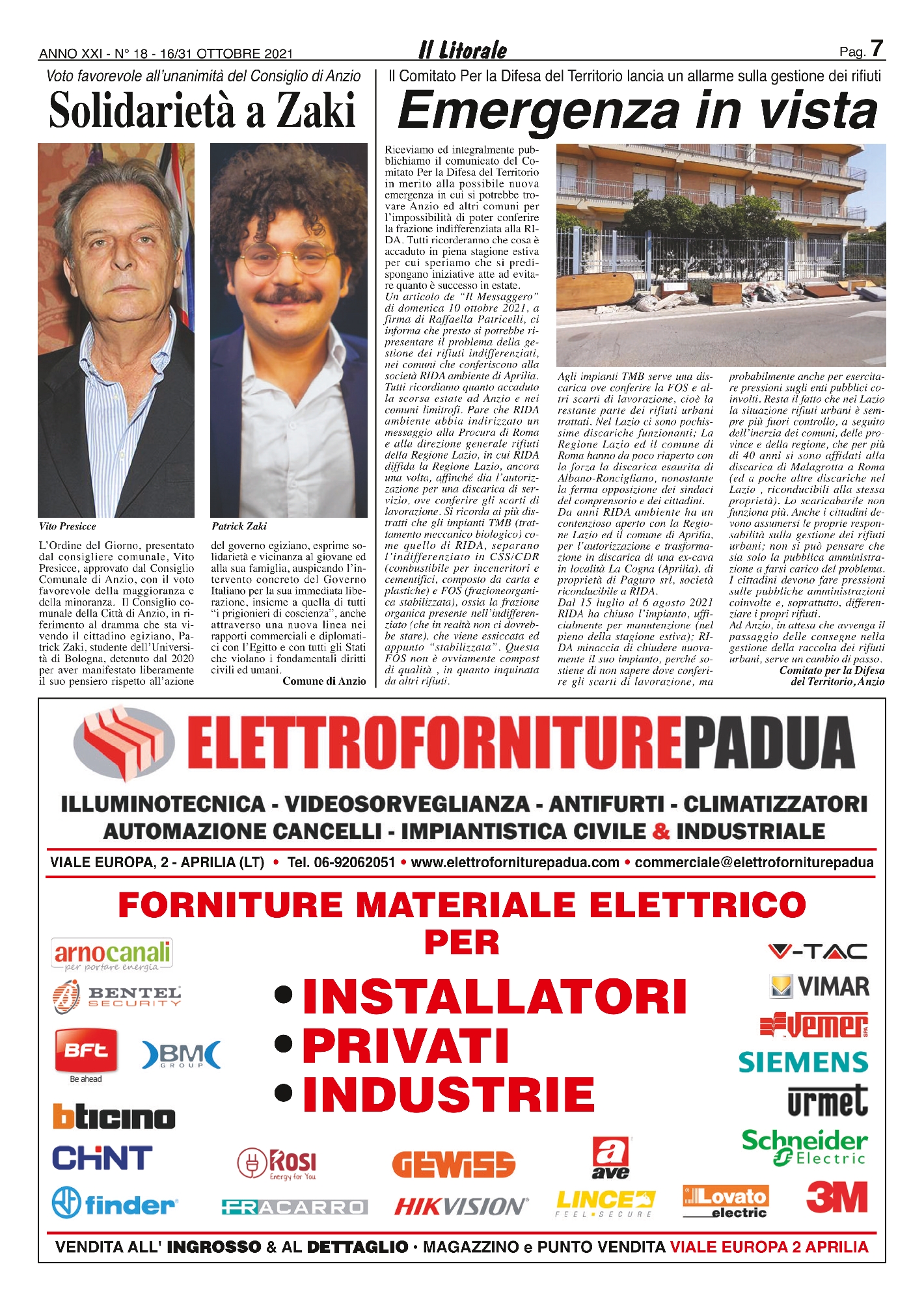 L’Ordine del Giorno, presentato dal consigliere comunale, Vito Presicce, approvato dal Consiglio Comunale di Anzio, con il voto favorevole della maggioranza e della minoranza. Il Consiglio comunale della Città di Anzio, in riferimento al dramma che sta vivendo il cittadino egiziano, Patrick Zaki, studente dell’Università di Bologna, detenuto dal 2020 per aver manifestato liberamente il suo pensiero rispetto all’azione del governo egiziano, esprime solidarietà e vicinanza al giovane ed alla sua famiglia, auspicando l’intervento concreto del Governo Italiano per la sua immediata liberazione, insieme a quella di tutti “i prigionieri di coscienza”, anche attraverso una nuova linea nei rapporti commerciali e diplomatici con l’Egitto e con tutti gli Stati che violano i fondamentali diritti civili ed umani.