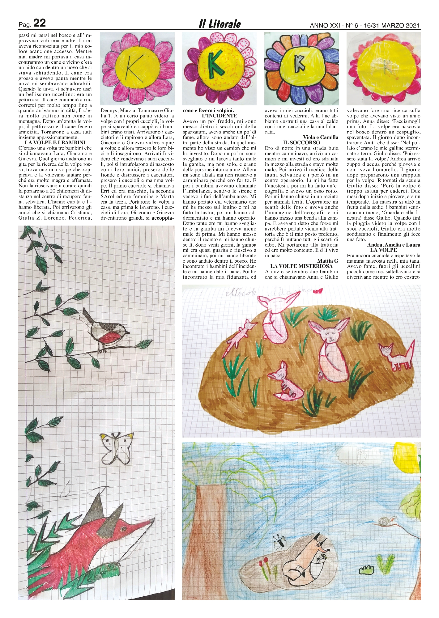 C’erano una volta tre bambini che si chiamavano Lara, Giacomo e Ginevra. Quel giorno andarono in gita per la ricerca della volpe rossa, trovarono una volpe che zoppicava e la volevano aiutare perché era molto magra e affamata. Non la riuscivano a curare quindi la portarono a 20 chilometri di distanza nel centro di recupero fauna selvatica. L’hanno curata e l’hanno liberata. Poi arrivarono gli amici che si chiamano Cristiano, Giulia Z, Lorenzo, Federica, Dennys, Marzia, Tommaso e Giulia T. A un certo punto videro la volpe con i propri cuccioli, la volpe si spaventò e scappò e i bambini erano tristi. Arrivarono i cacciatori e li rapirono e allora Lara, Giacomo e Ginevra videro rapire a volpe e allora presero le loro bici e li inseguirono. Arrivati lì videro che vendevano i suoi cuccioli, poi si intrufolarono di nascosto con i loro amici, presero delle fionde e distrussero i cacciatori, presero i cuccioli e mamma volpe. Il primo cucciolo si chiamava Erri ed era maschio, la seconda SArol ed era femmina e Marta era la terza. Portarono le volpi a casa, ma prima le lavarono. I cuccioli di Lara, Giacomo e Ginevra diventarono grandi, si accoppiarono e fecero i volpini.