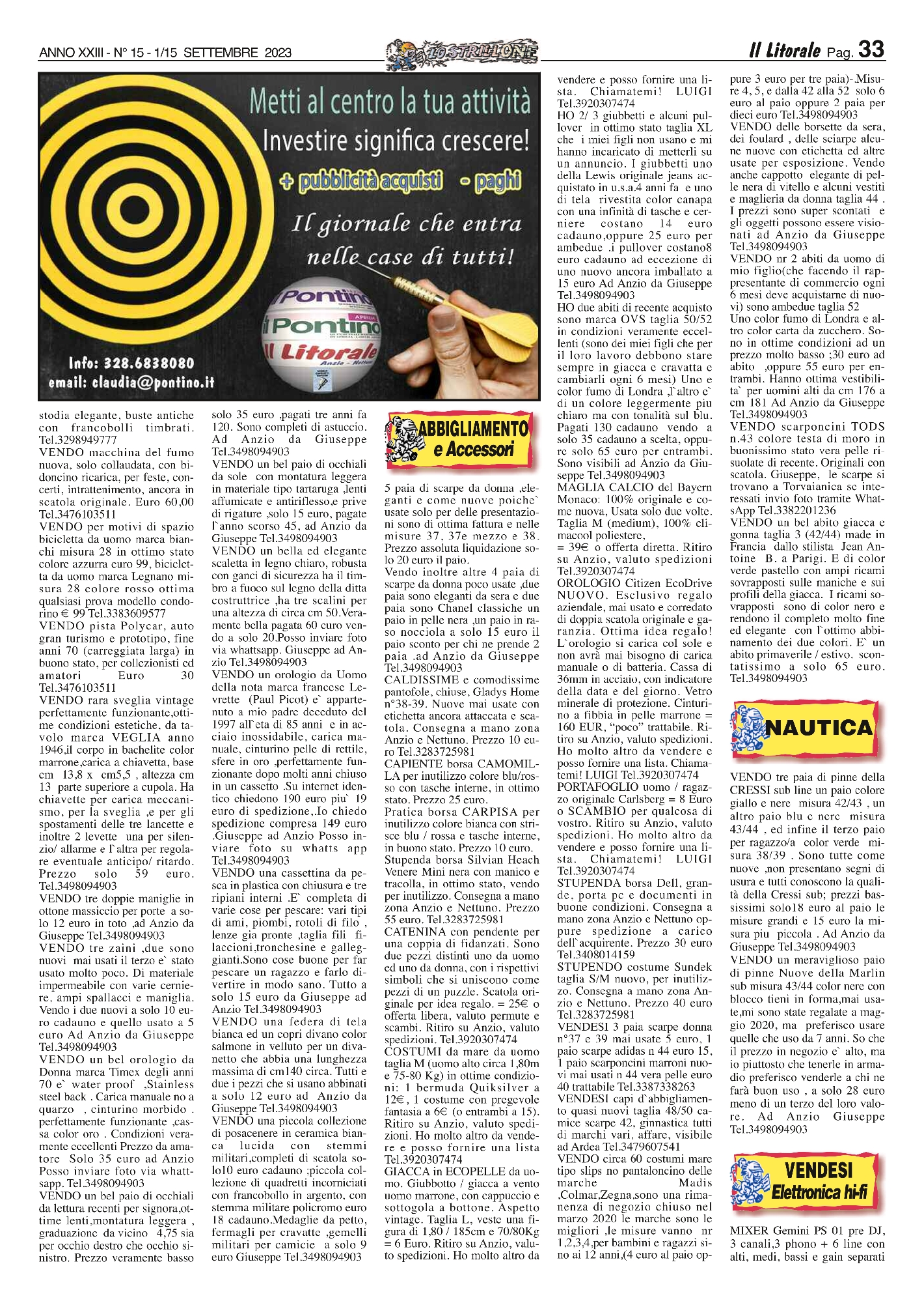 HO 2/ 3 giubbetti e alcuni pullover in ottimo stato taglia XL che i miei figli non usano e mi hanno incaricato di metterli su un annuncio. I giubbetti uno della Lewis originale jeans acquistato in u.s.a.4 anni fa e uno di tela rivestita color canapa con una infinità di tasche e cerniere costano 14 euro cadauno,oppure 25 euro per ambedue .i pullover costano8 euro cadauno ad eccezione di uno nuovo ancora imballato a 15 euro Ad Anzio da Giuseppe Tel.3498094903