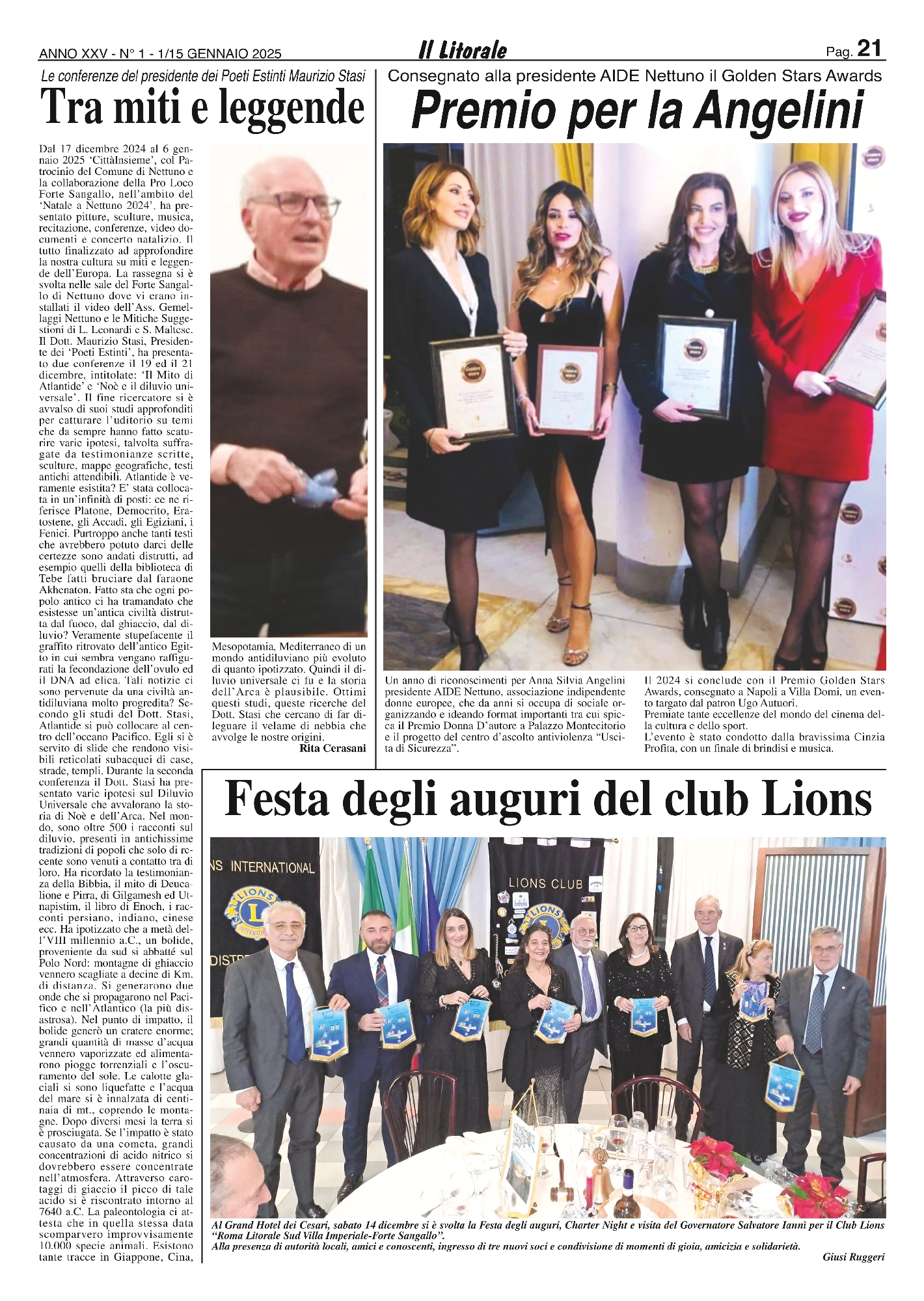 Dal 17 dicembre 2024 al 6 gennaio 2025 ‘CittàInsieme’, col Patrocinio del Comune di Nettuno e la collaborazione della Pro Loco Forte Sangallo, nell’ambito del ‘Natale a Nettuno 2024’, ha presentato pitture, sculture, musica, recitazione, conferenze, video documenti e concerto natalizio. Il tutto finalizzato ad approfondire la nostra cultura su miti e leggende dell’Europa. La rassegna si è svolta nelle sale del Forte Sangallo di Nettuno dove vi erano installati il video dell’Ass. Gemellaggi Nettuno e le Mitiche Suggestioni di L. Leonardi e S. Maltese.