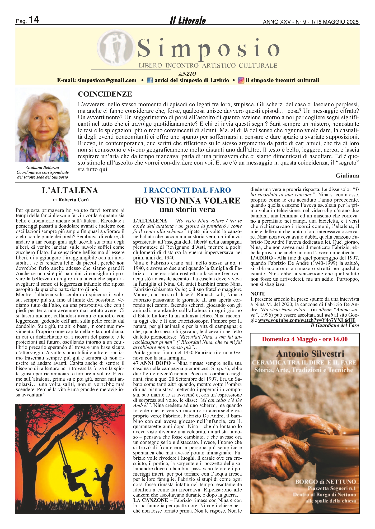 Il presente articolo ha preso spunto da una intervista a Nina M. del 2020; la canzone di Fabrizio De André “Ho visto Nina volare” (in album “Anime salve”, 1996) può essere ascoltata sul web al sito Google www.youtube.com/watch?v=Y4o7YXL6dIE