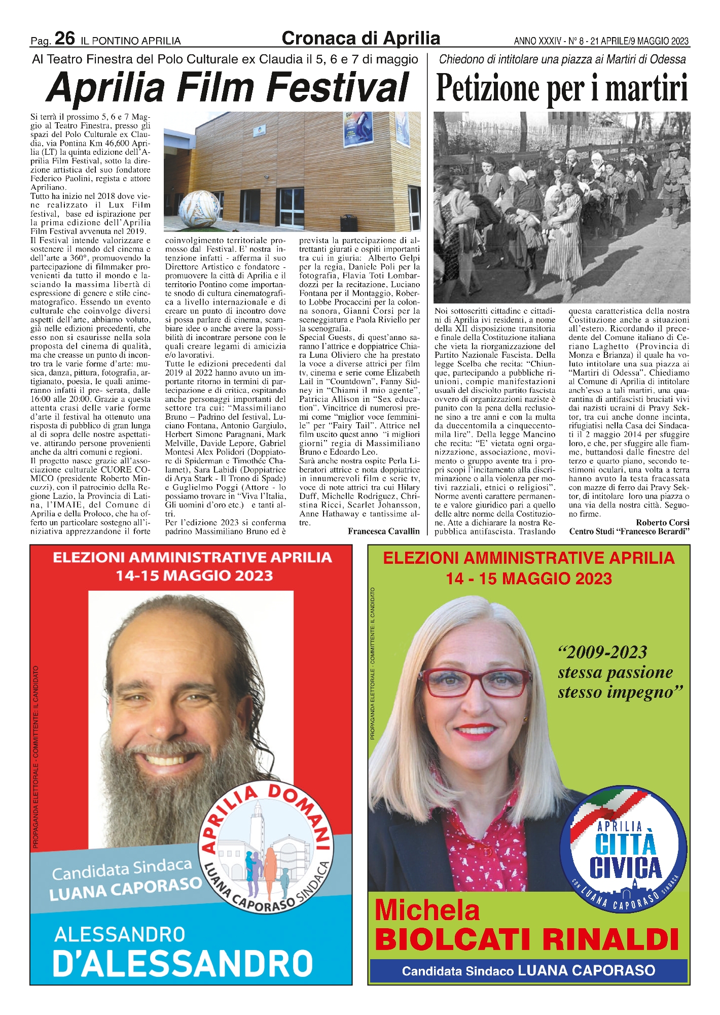 Si terrà il prossimo 5, 6 e 7 Maggio al Teatro Finestra, presso gli spazi del Polo Culturale ex Claudia, via Pontina Km 46,600 Aprilia (LT) la quinta edizione dell’Aprilia Film Festival, sotto la direzione artistica del suo fondatore Federico Paolini, regista e attore Apriliano.