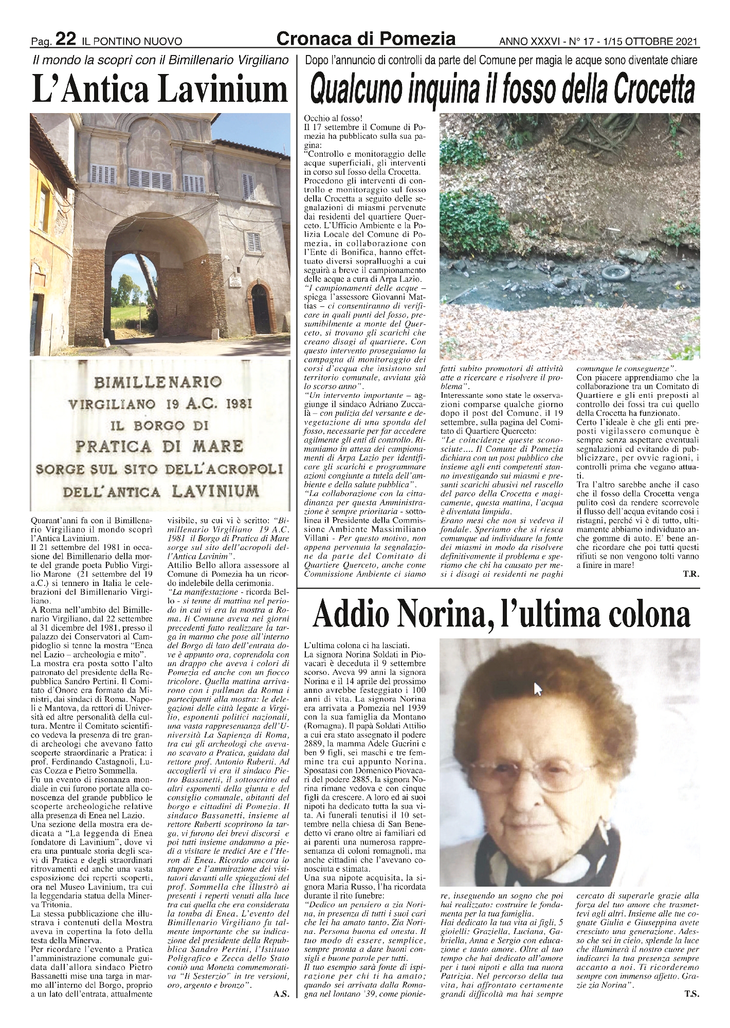 La signora Norina Soldati in Piovacari è deceduta il 9 settembre scorso. Aveva 99 anni la signora Norina e il 14 aprile del prossimo anno avrebbe festeggiato i 100 anni di vita. La signora Norina era arrivata a Pomezia nel 1939 con la sua famiglia da Montano (Romagna). Il papà Soldati Attilio a cui era stato assegnato il podere 2889, la mamma Adele Guerini e ben 9 figli, sei maschi e tre femmine tra cui appunto Norina. Sposatasi con Domenico Piovacari del podere 2885, la signora Norina rimane vedova e con cinque figli da crescere. A loro ed ai suoi nipoti ha dedicato tutta la sua vita. Ai funerali tenutisi il 10 settembre nella chiesa di San Benedetto vi erano oltre ai familiari ed ai parenti una numerosa rappresentanza di coloni romagnoli, ma anche cittadini che l’avevano conosciuta e stimata.