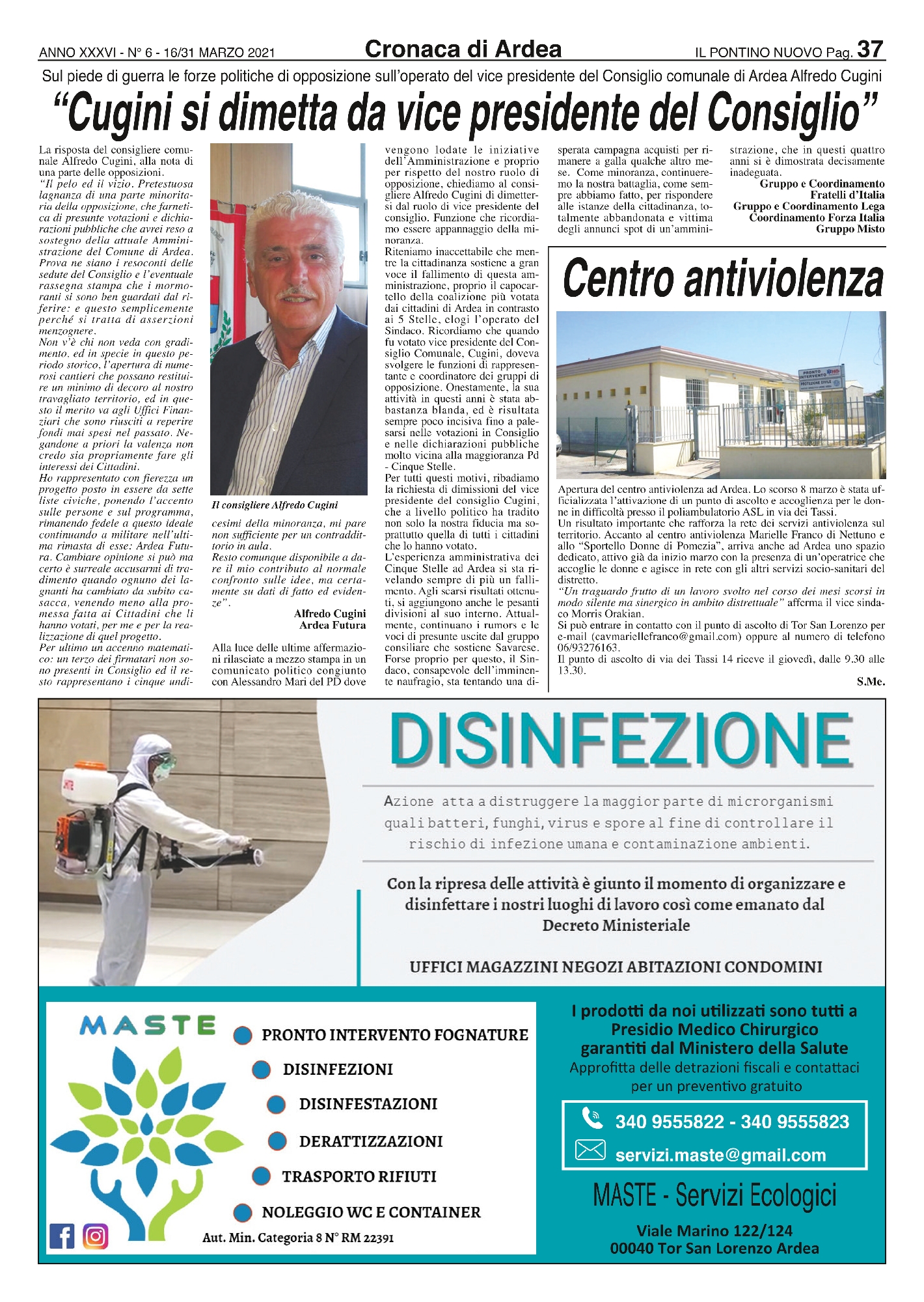 Riteniamo inaccettabile che mentre la cittadinanza sostiene a gran voce il fallimento di questa amministrazione, proprio il capocartello della coalizione più votata dai cittadini di Ardea in contrasto ai 5 Stelle, elogi l’operato del Sindaco. Ricordiamo che quando fu votato vice presidente del Consiglio Comunale, Cugini, doveva svolgere le funzioni di rappresentante e coordinatore dei gruppi di opposizione. Onestamente, la sua attività in questi anni è stata abbastanza blanda, ed è risultata sempre poco incisiva fino a palesarsi nelle votazioni in Consiglio e nelle dichiarazioni pubbliche molto vicina alla maggioranza Pd - Cinque Stelle.